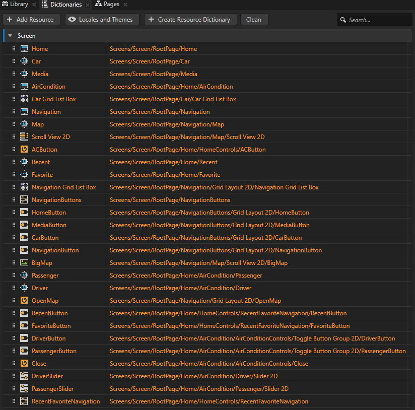 - The resource dictionary of the Screen node contains aliases for nodes in the project. Aliases provide a convenient way to set nodes in a focus chain and access them from JavaScript scripts in the application.