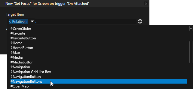 When you start the application, Kanzi by default sets the focus to the Screen node. You use the On Attached trigger to set focus to the navigation bar when you start the application.