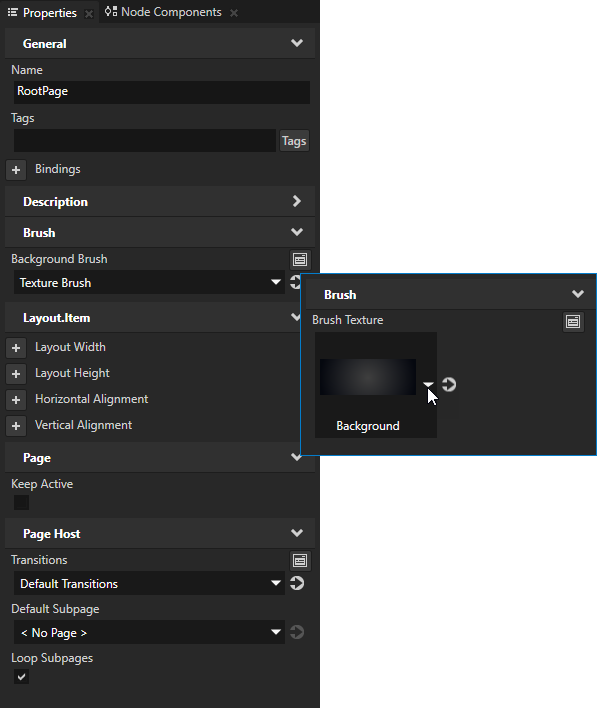 - In the Project select the RootPage node, in the Properties set the Background Brush property to + Texture Brush, name the brush, click
