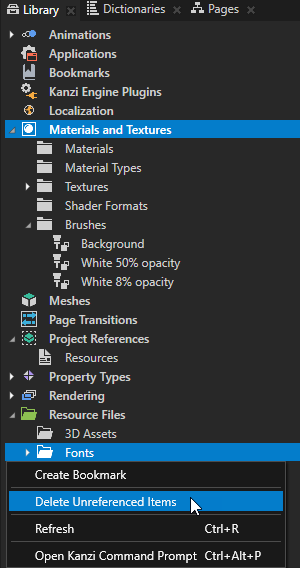 - In the Library select the Materials and Textures and Fonts libraries, right-click Fonts, and select Delete Unreferenced Items.