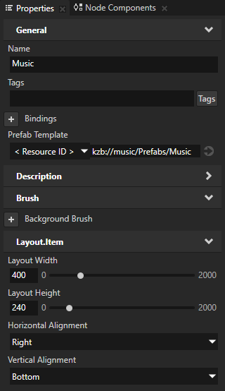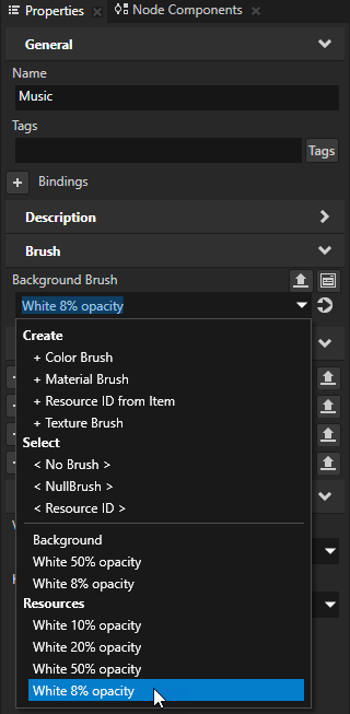 - In the project tab bar select the Music project, in the Prefabs select the Music prefab, and in the Properties set the Background Brush property to the White 8% opacity color brush of the Resources project.
