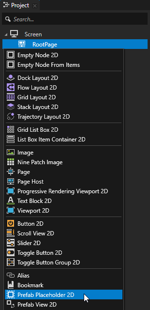 - In the project tab bar select the Center stack project, in the Project press Alt and right-click the RootPage node, select Prefab Placeholder 2D, and name it Stats.