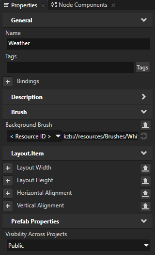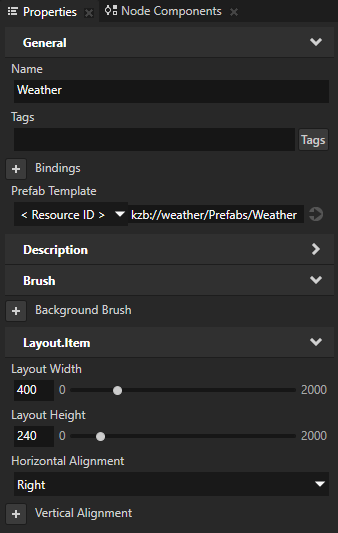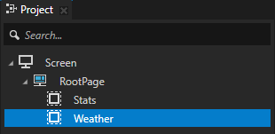 - In the project tab bar select the Center stack project, in the Project select the RootPage node, create a Prefab Placeholder 2D node, name it Weather, and in the Properties add and set: