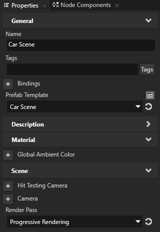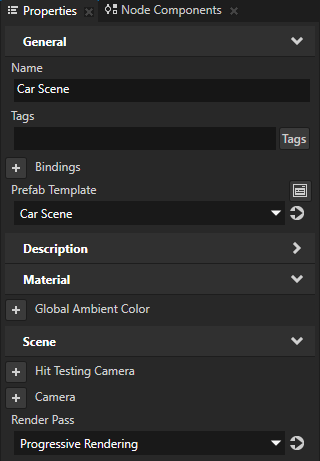 - In the Project select the RootPage > Grid Layout 2D > Toggle Car Animation > Viewport 2D > Car Scene node and in the Properties set the Render Pass property to Progressive Rendering.
