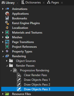 - In the Library > Rendering > Render Passes > Progressive Rendering right-click the Draw Objects Pass 1 render pass, select Duplicate, press the F2 key, and rename it to Draw Objects Pass 3.