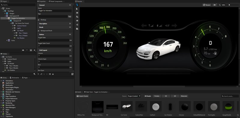 - The Toggle Car Animation node uses the Toggle Car Animation State Manager state manager to control the animations which change the position of the speed and RPM gauges, and move the speed and RPM needles.