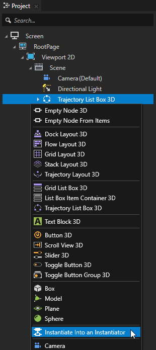 - In the Project press Alt and right-click the Trajectory List Box 3D node and select Instantiate Into an Instantiator.
