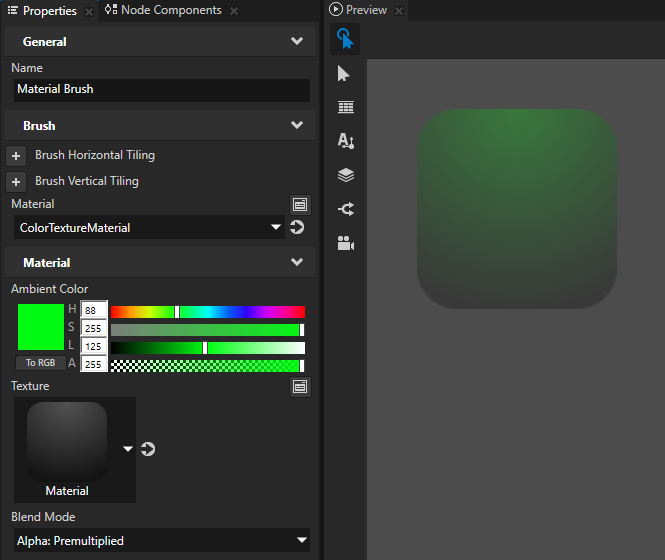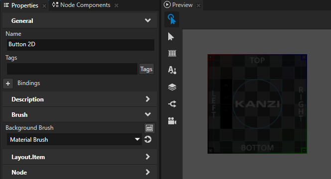 For example, create a Button 2D node, in the Properties add the Background Brush property, and set it to the brush you created in the first step.