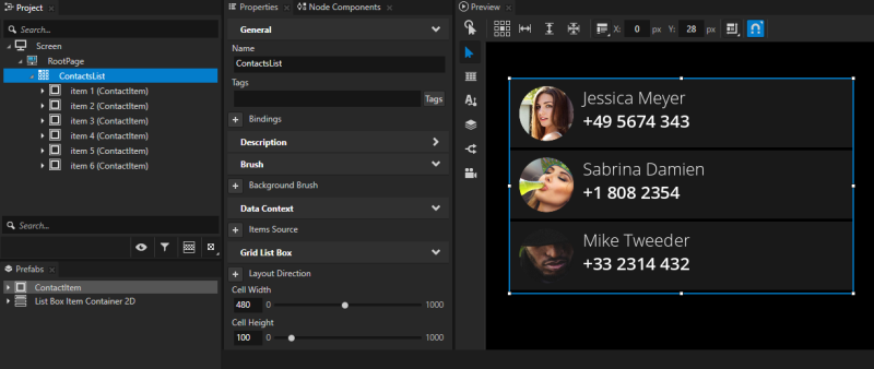 For example, create a Grid List Box 2D node called ContactsList and use it as a container to present address book contacts.