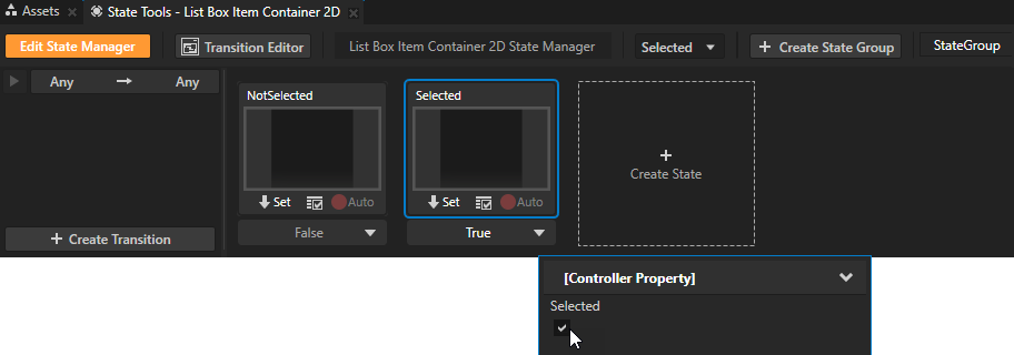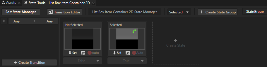 - In the Prefabs select the List Box Item Container 2D and in the State Tools create a State Manager with two states. See Using state managers.
