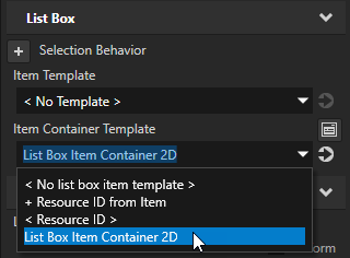 The Item Container Template property allows you to share functionality between the items in a list box. When you set the Item Container Template property, each item in the list box inherits the functionality from the List Box Item Container node. For example, the Item Container Template can contain a state manager which changes the scale of the selected item in the list box. This way you do not need to set the functionality for each item.