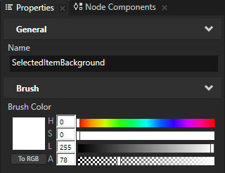 - Create two color brushes, one for the background of the selected item and another one for the background of the other items. See Filling 2D nodes with a solid color.