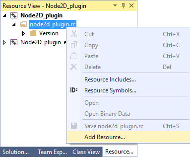2. In the Solution Explorer double-click the Resource File (<ProjectName>.rc) of your plugin project to open the Resource View, right-click the selected .rc folder, select Add Resource, and import the .ico file you want to use as the icon for your node.