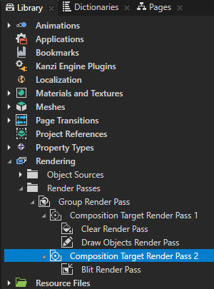 - In the Library in the Group Render Pass create a second Composition Target Render Pass and drag the Blit Render Pass to that Composition Target Render Pass.