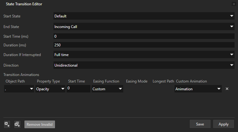 - Transition Animations enables you to use a custom animation for the transition. See Using custom easing functions in state transitions.