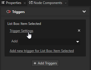 To remove a trigger, in the Node Components > Triggers section right-click the trigger you want to remove and select Remove.