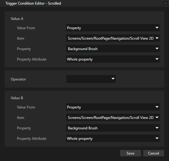 In the Trigger Condition Editor set:- In the Value A section define the property type and value that you want to use for the condition. To use a value from a property, set: