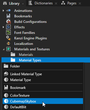 Kanzi Studio creates in the Library > Materials and Textures the CubemapSkybox material type and CubemapSkyboxMaterial, which supports showing a cubemap texture as a skybox.