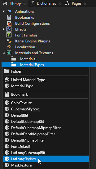 Kanzi Studio creates in the Library > Materials and Textures the LatLongSkybox material type and LatLongSkyboxMaterial, which supports showing a lat-long environment texture as a skybox.