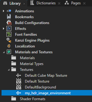 Kanzi Studio imports the image and creates in the Library > Materials and Textures > Textures an environment Cubemap Texture for that image.