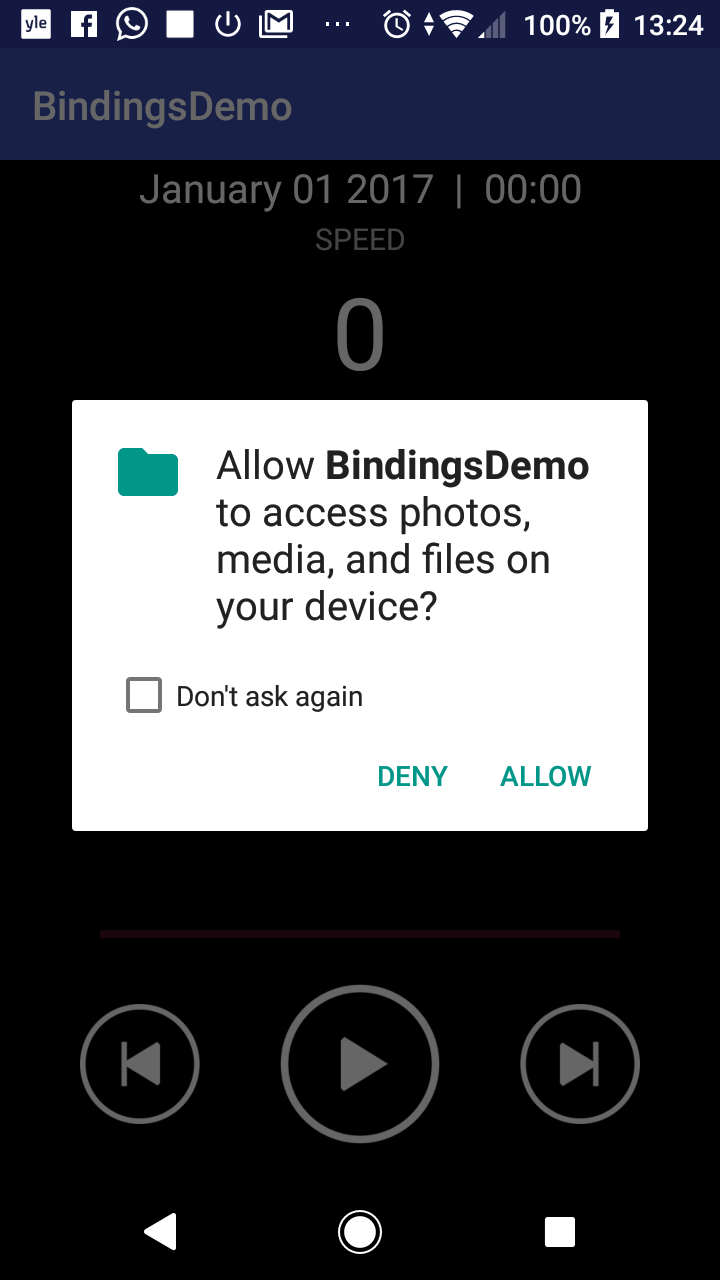 When you run the example the first time, the application asks for access to the device SD card because it tries to read the connection.xml file on the device SD card.
