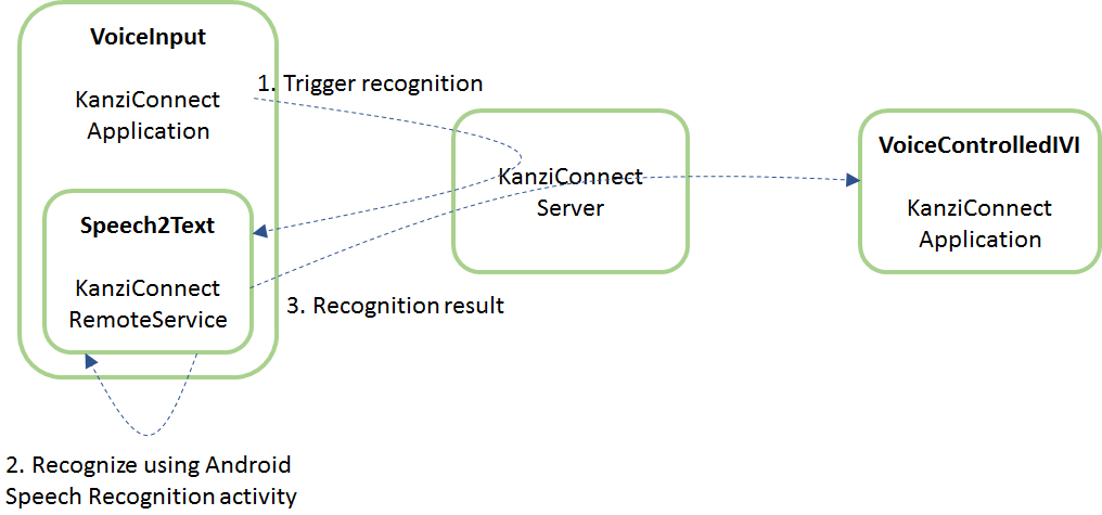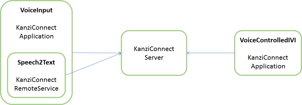 The VoiceInput application records voice commands from the user and dispatches them to a Kanzi Connect Server.