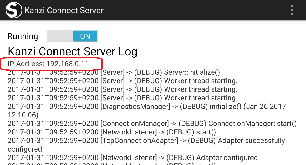 In the connection.xml file of the phone set the address to the IP address of the tablet. You can check the IP address from the text output of the Kanzi Connect Server when you run it on Android. Here the IP address is 192.168.0.11: