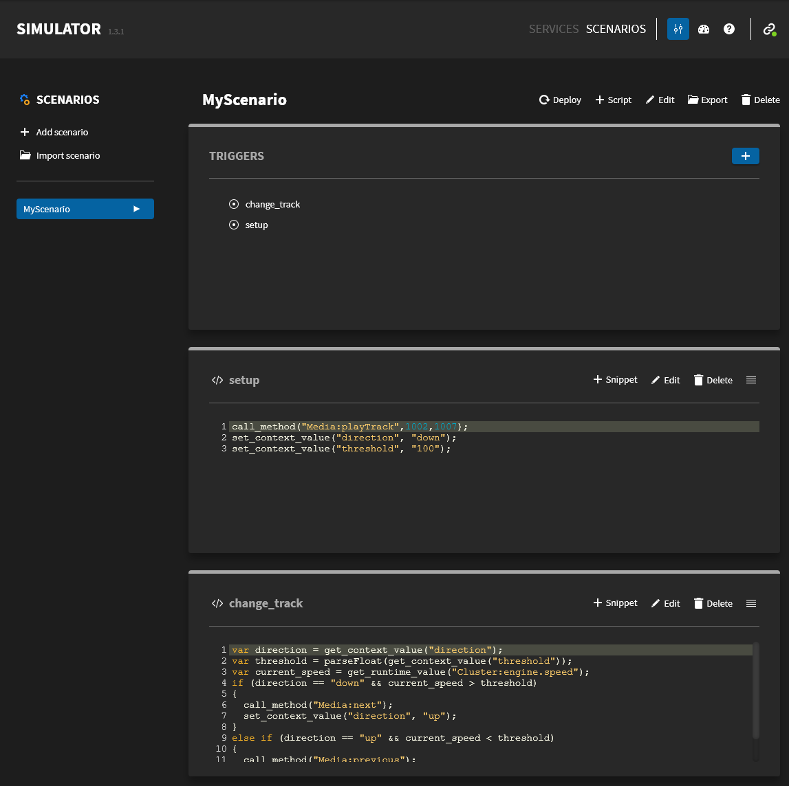 The Scenario service enables you to simulate and test your application using the Kanzi Connect service interfaces.