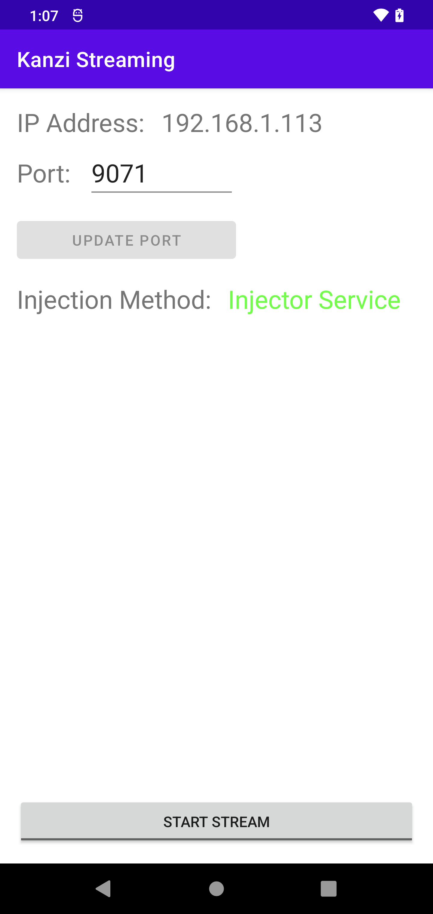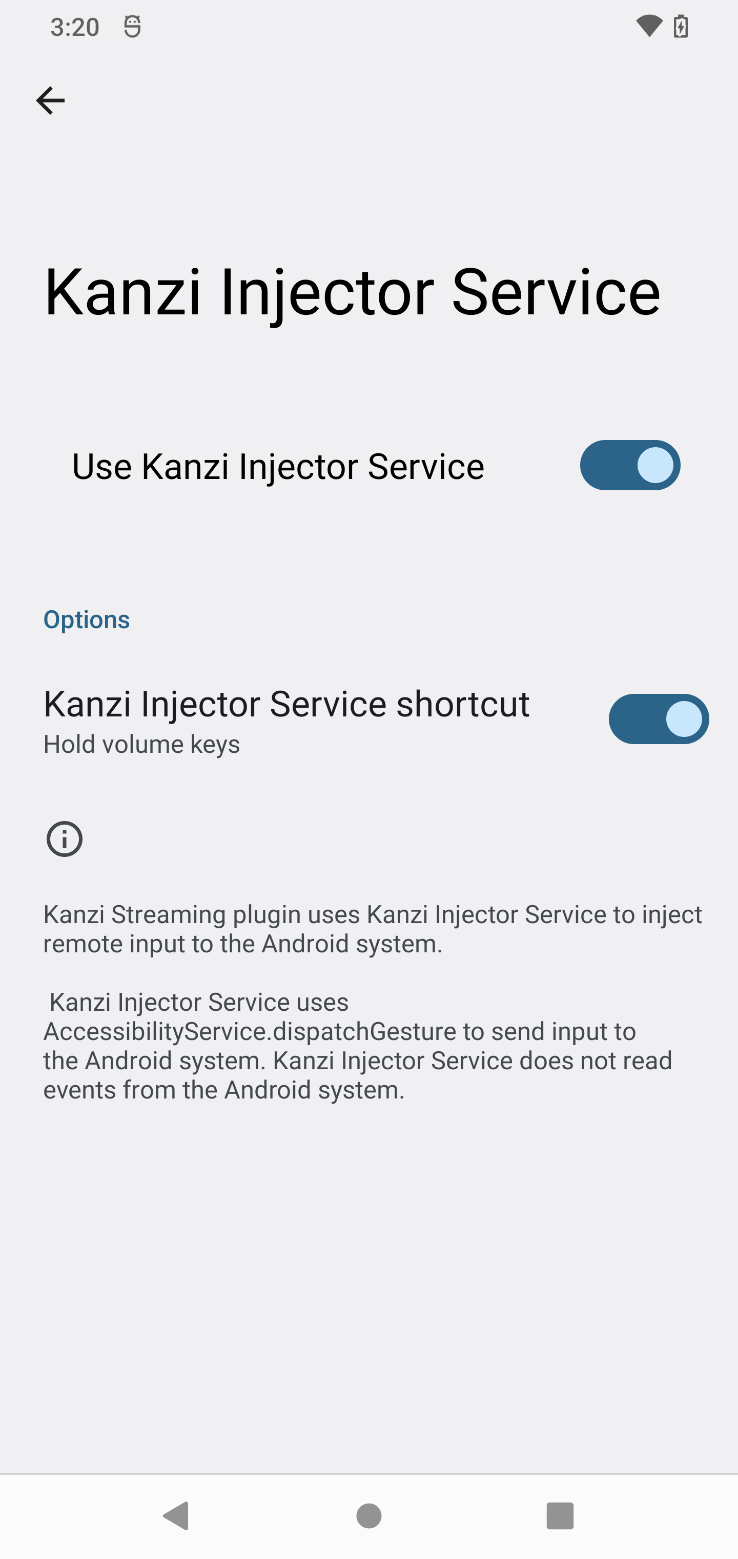 Kanzi Injector Service, which uses the Android accessibility service API to inject input. This is the recommended option. See Setting up Android Streaming Application with Kanzi Injector Service.